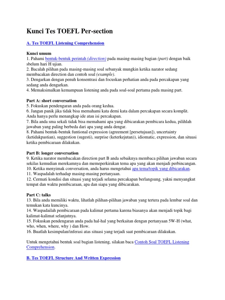 Download contoh soal toefl pasca sarjana terbaru gratis listening comprehension grammar structure and written expression reading contoh soal tes toefl pbt. During the test you can deal with the different accents (british, australian, american), and we recommend you to practice in perception of these accents. Berikut adalah beberapa contoh pertanyaan rekaman audio, untuk setiap bagian, yang selalu diurutkan berdasarkan tingkat kesulitan. All you have to do is pay attention to some short conversations and answer a few questions on listening is the second of four sections on the toefl. Menjawab soal toefl dengan benar: